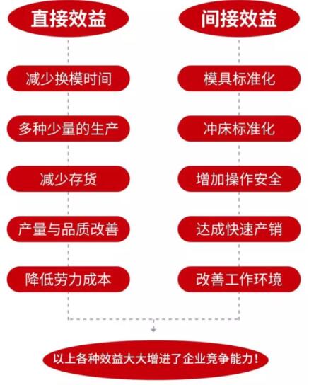 沖床快速換模系統由磁力模板、電控操作箱及相關系統配件組合而成,通過磁力夾緊模具,將沖床模具的換模時間、生產啟動時間、調整時間等盡可能縮減至最小,使沖床使用者能夠快速更換模具與夾緊模具,減少換模時間,適應多樣化生產之需求,同時有效的改善質量、降低勞力成本,降低換模時間,獲取直接效益。所以換模效率的提高,相當于整體效益提高!